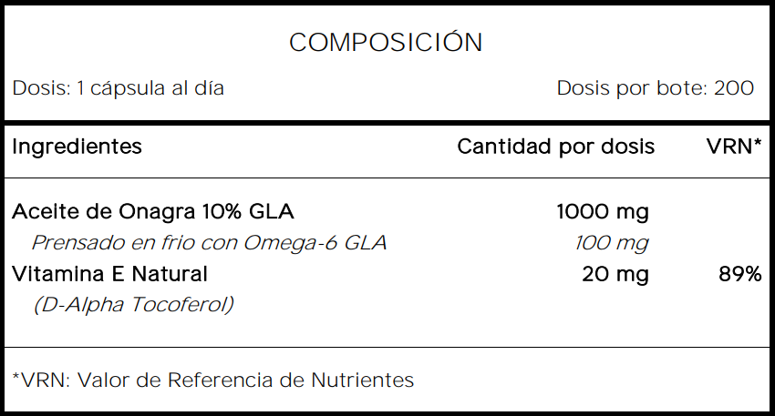 EL MEJOR ACEITE DE ONAGRA: Elaborado a partir de Aceite de Onagra 100% Natural con un 10% del principio activo GLA (10 mg de Ácido Gamma-Linolénico), responsable de las propiedades terapéuticas del producto. También hemos añadido 20 mg de Vitamina E, un potente antioxidante que penetra en las membranas celulares, protegiéndolas del daño oxidativo. Servimos el producto en formato de perlas de aceite para garantizar una óptima biodisponibilidad y absorción.