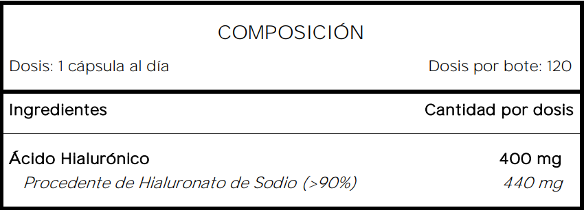 EL MEJOR ÁCIDO HIALURÓNICO: Elaborado con Hialuronato de Sodio al 90% aportando 400 mg de Ácido Hialurónico puro de máxima calidad y alto peso molecular (800 – 1500 kDa), similar al generado naturalmente por nuestro organismo. Por tanto, nuestro producto garantiza la óptima biodisponibilidad, absorción y eficacia.