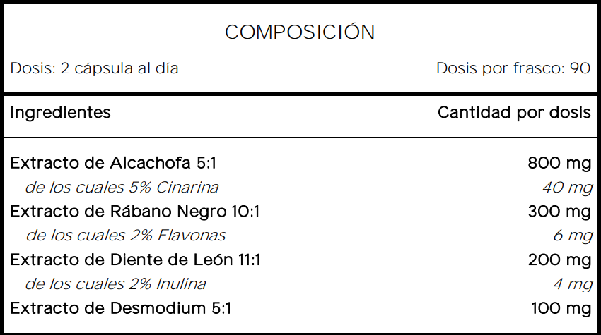 EXCELENTE FÓRMULA a base de Extractos naturales de Alcachofa, Rábano Negro, Diente de León y Desmodium. Gracias a su efecto diurético puede ayudar a depurar y detoxificar el sistema gastrointestinal.