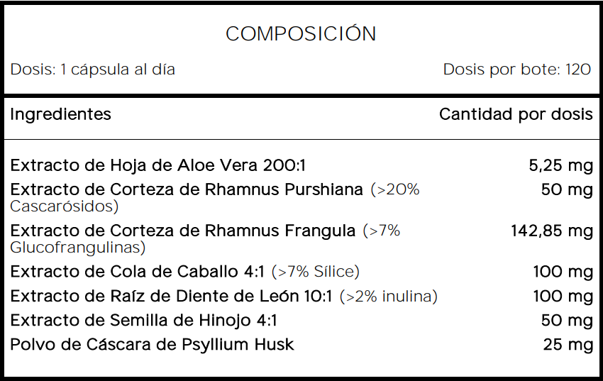 Extracto de Frángula (Corteza), Extracto de Cola de Caballo (Partes aéreas), Extracto de Diente de León (Raíz), Almidón de maíz, Agente de recubrimiento (Hidroxipropilmetilcelulosa), Extracto de Hinojo (Semilla), Extracto de Cáscara Sagrada (Corteza), Cáscara de Psyllium (Polvo), Extracto de Aloe Vera (Hoja).