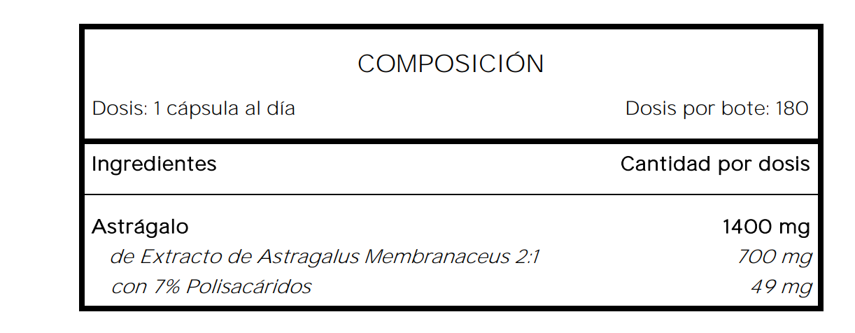 Cada cápsula está elaborada con 700 mg de Extracto Natural de raíz de Astragalus Membranaceus 2:1, equivalente a 1400 mg de Astrágalo, al 7% en Polisacáridos aportando 49 mg por cápsula.