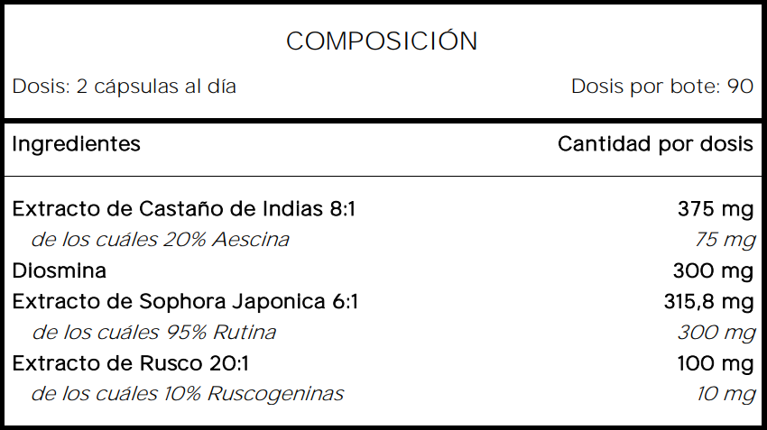 EL MEJOR CASTAÑO DE INDIAS: Cada dosis (2 cápsulas) está elaborada con 375 mg de Extracto Natural de Castaño de Indias concentrado con un ratio 8:1 equivalente a 3000 mg de Castaño de Indias puro, con un 20% en Aescina aportando 75 mg, 300 mg de Diosmina, 315,80 mg de Extracto Natural de Sophora Japonica concentrado con un ratio 6:1, con un 95% en Rutina aportando 300 mg y 100 mg de Extracto Natural de Rusco concentrado con un ratio 20:1, con un 10% en Ruscogeninas aportando 10 mg.