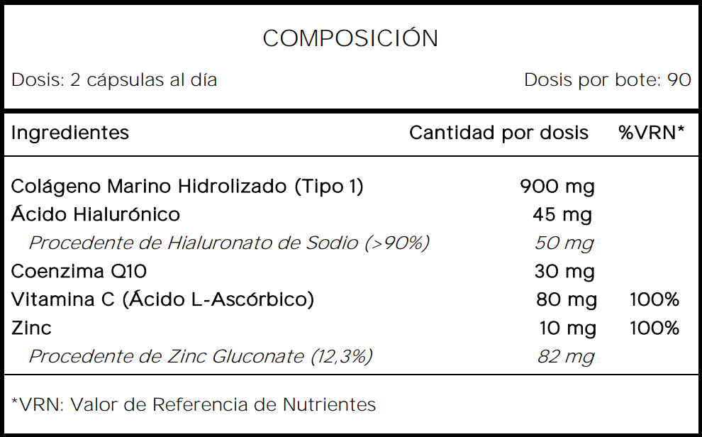 Colágeno Marino (PESCADO), Agente de recubrimiento (Gelatina Bovina), Gluconato de Zinc, Ácido L-Ascórbico, Hialuronato de Sodio, Coenzima Q10, Almidón de Maíz.