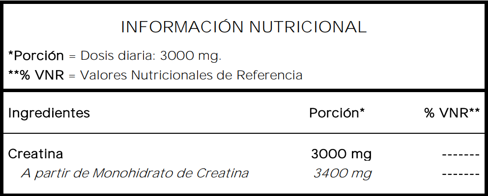 EXCELENTE FÓRMULA a base de Monohidrato de Creatina 100% pura, vegana y sin gluten para ayudar a aumentar la masa muscular e incrementar la fuerza y la resistencia física. Sin sabor y sin edulcorantes ni colorantes.