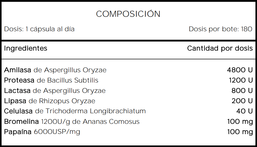 LAS MEJORAS ENZIMAS DIGESTIVAS: Cada cápsula contiene 4800U de Amilasa procedente de Aspergillus Oryzae, 1200U de Proteasa procedente de Bacillus Subtilis, 800U de Lactasa procedente de Aspergillus Oryzae, 200U de Lipasa procedente de Rhizopus Oryzae, 40U de Celulasa procedente de Trichoderma Longibrachiatum, 100 mg de Bromelina procedente de Ananas Comosus y 100 mg de Papaína.
