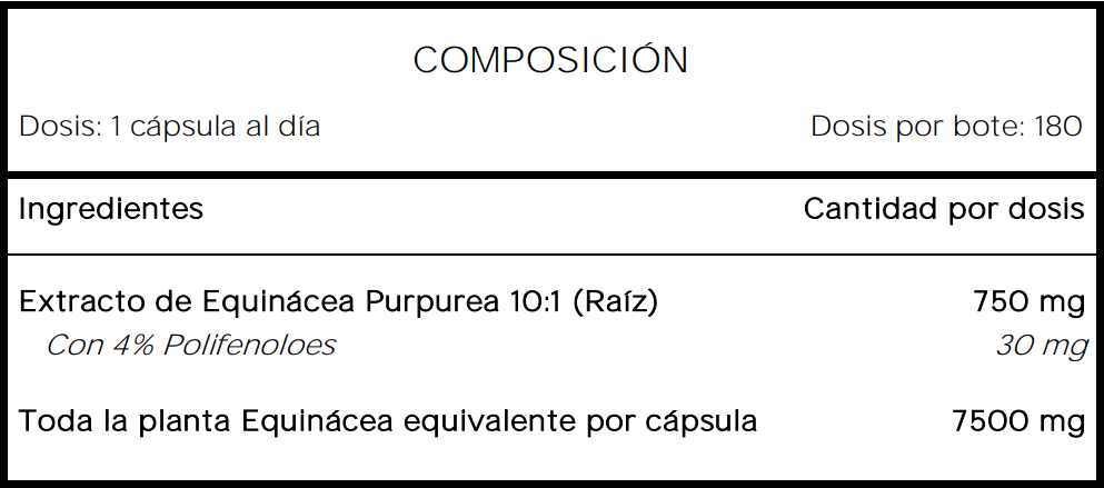 LA MEJOR EQUINÁCEA: Cada cápsula contiene 7500 mg de Equinácea, elaborada a partir de 750 mg de extracto natural de raíz de Echinacea Purpurea 10:1 certificado al 4% en Polifenoles.