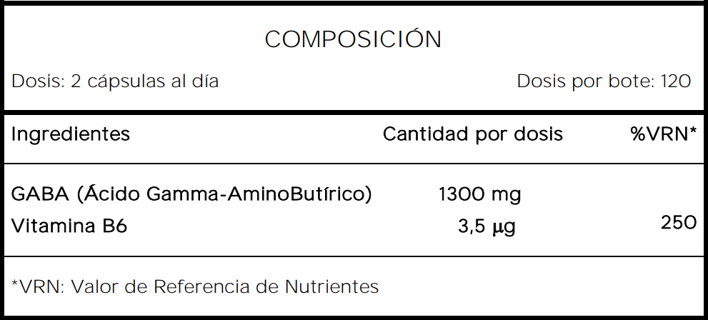Ácido Gamma-Amino Butírico (GABA), Agente de recubrimiento (Hidroxipropilmetilcelulosa), Almidón de arroz, Clorhidrato de Piridoxina (Vitamina B6).