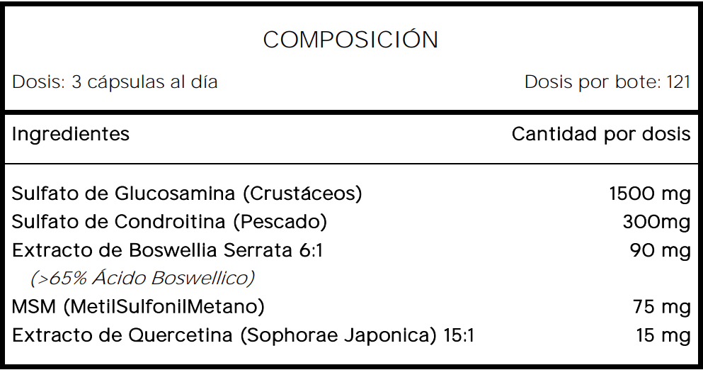 Sulfato de Glucosamina 2KCL (CRUSTÁCEOS), Sulfato de Condroitina (PESCADO), Agente de recubrimiento (Gelatina Bovina), Almidón de arroz, Extracto de Boswellia Serrata, MSM (MetilSulfonilMetano), Extracto de Quercetina (Sophora Japónica).