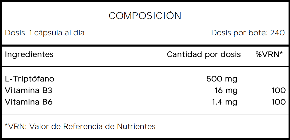 EL MEJOR TRIPTÓFANO: Cada cápsula está elaborada con 500 mg de L-Triptófano puro, 16 mg de Vitamina B3 (100% VRN) y 1,4 mg de Vitamina B6 (100% VRN).