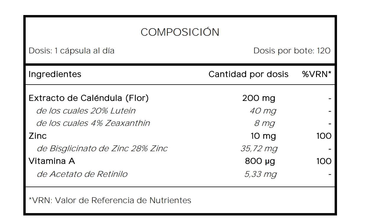 Cada cápsula está elaborada con 200 mg de Extracto Natural de Flor de Caléndula concentrado con un 20% en Luteína y un 4% en Zeaxantina aportando respectivamente 40 mg de Luteína y 8 mg de Zeaxantina por cápsula. Además hemos añadido 10 mg de Zinc procedente de Bisglicinato de Zinc y 800 mcg de Vitamina A procedente de Acetato de Retinilo.