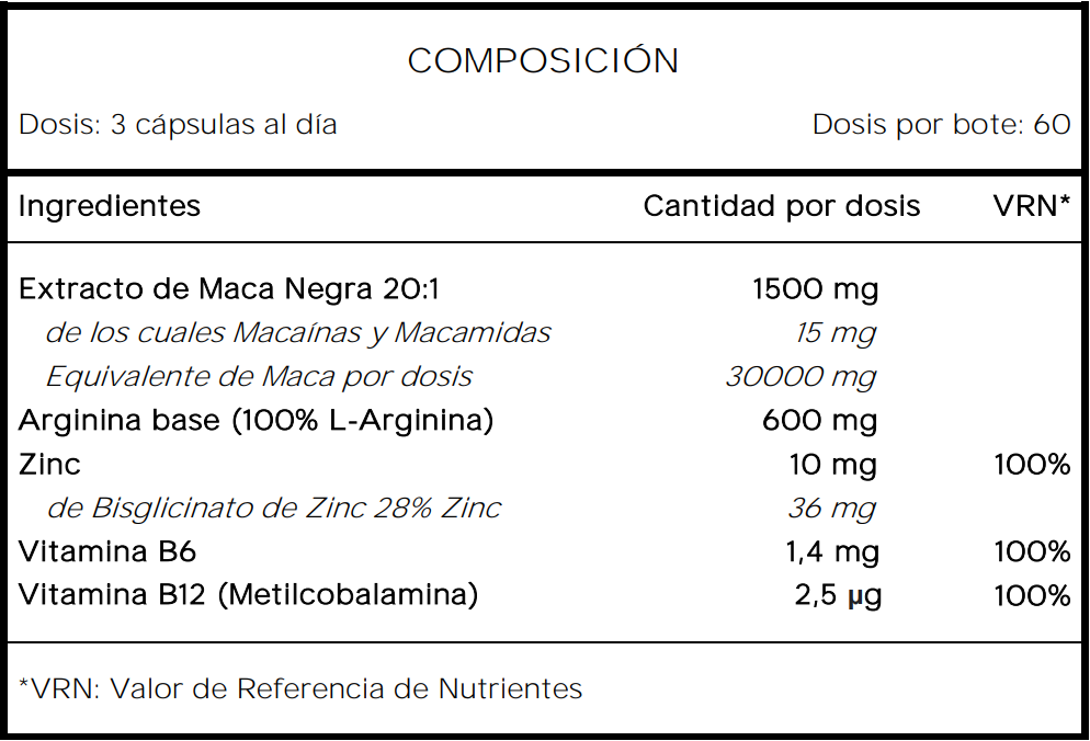 LA MEJOR MACA NEGRA: Cada dosis (3 cápsulas) está elaborada con 1500 mg de Extracto Natural de Maca Negra Peruana concentrado con un ratio 20:1 equivalente a 30000 mg de Maca Negra pura y 15 mg de Macainas y Macamidas, 600 mg de Arginina base al 100% en L-Arginina, 36 mg de Bisglicinato de Zinc al 28% en Zinc aportando 10 mg de Zinc puro, 1,4 mg de Vitamina B6 Piridoxina y 2,5 mcg de Vitamina B12 en su forma Metilcobalamina.