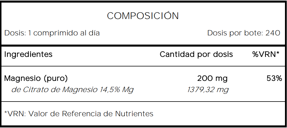 EXCELENTE FÓRMULA a base de Magnesio puro (obtenido de su forma Citrato) que mejora la función muscular y el sistema nervioso, reduce el cansancio y la fatiga, y activa el metabolismo.