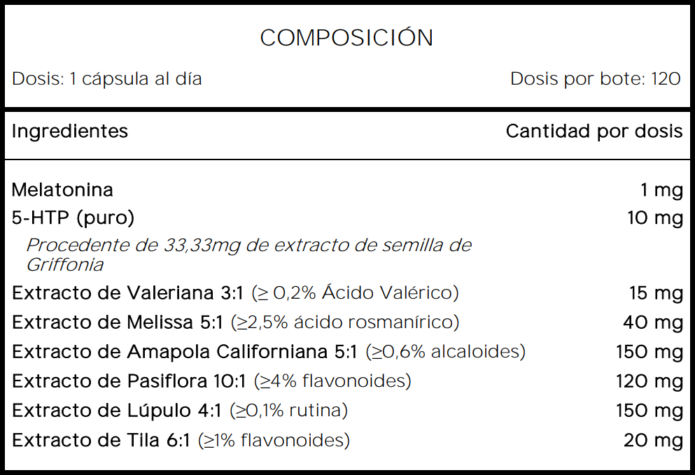 Extractos de: Amapola Californiana, Lúpulo, Pasiflora, Agente de recubrimiento (Hidroxipropilmetilcelulosa), Extractos de: Melisa, Grifonia, Almidón de maíz, Extractos de: Tila, Valeriana, Melatonina.