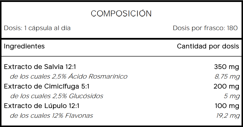EL MEJOR MENOPAUSE COMPLEX: Cada cápsula está elaborada con 350 mg de Extracto Natural de Hojas de Salvia Officinalis 12:1 al 2.5% en Ácido Rosmarínico aportando 8,75 mg de Ácido Rosmarínico, 200 mg de Extracto Natural de Raíz de Cimicífuga Racemosa 5:1 al 2.5% en Glucósidos Terpénicos aportando 5 mg de Glucósidos y 160 mg de Extracto Natural de Estróbilo de Lúpulo (Humulus Lupulus) 12:1 al 12% en Flavonas aportando 19,20 mg de Flavonas.