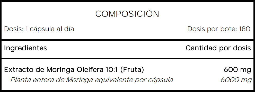 LA MEJOR MORINGA OLEIFERA: Cada cápsula contiene 6000 mg de Moringa elaborado a partir de 600 mg de extracto natural del fruto de la Moringa Oleifera con una concentración 10:1.