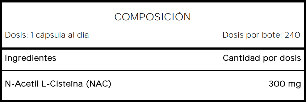 LA MEJOR N-ACETIL L-CISTEÍNA: Elaborada con 300 mg de la mejor N-Acetil L-Cisteína por cápsula, de alta biodisponibilidad y eficacia garantizada. La N-Acetil L-Cisteína o NAC es la molécula estable del aminoácido L-Cisteína y tiene una gran capacidad antioxidante eliminando las especies reactivas de oxígeno (ROS) tan dañinas para las células del organismo. El NAC es un excelente mucolítico, quelante de metales pesados, antiinflamatorio y antivírico.