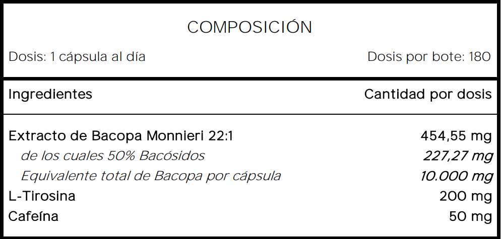EL MEJOR NOOTRÓPICO: Cada cápsula está elaborada con 454,55 mg de Extracto Natural de Bacopa Monnieri concentrado 22:1 aportando 10000 mg de Bacopa Monnieri con un 50% de Bacósidos equivalente a 227,27 mg, 200 mg de L-Tirosina, un aminoácido semi-esencial y 50 mg de Cafeína.