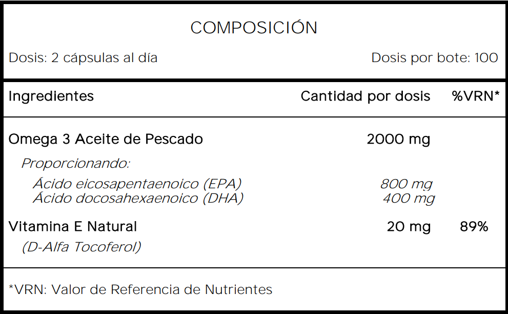 Cada dosis de nuestro producto está elaborado con 2000 mg de Omega 3, con 800 mg de EPA, 400 mg de DHA y 20 mg de Vitamina E Natural.