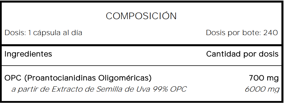 EL MEJOR OPC: Cada cápsula está elaborada con 708 mg de Extracto de Semilla de Uva al 99% en OPC aportando 700 mg de OPC (Proantocianidinas Oligoméricas).