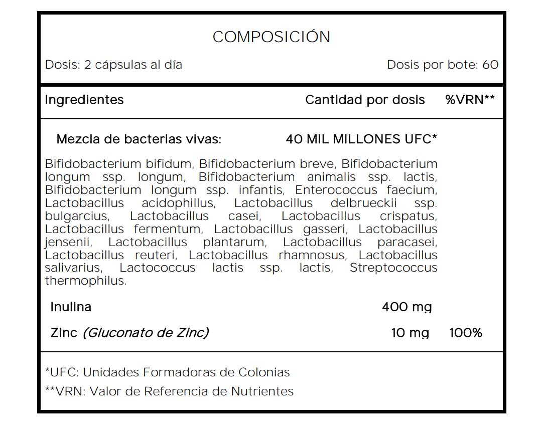 Cada dosis contiene 40 Mil Millones de UFC procedentes de 20 cepas probióticas distintas, 400 mg de Inulina procedente de la raíz de la Achicoria (Cichorium intybus L.) y 10 mg de Zinc puro (100% VRN*) procedente de