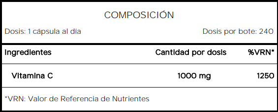 EXCELENTE FÓRMULA a base de Vitamina C (Ácido Ascórbico) que reduce el cansancio y la fatiga, protege las células del estrés oxidativo, y mejora el sistema inmunológico.